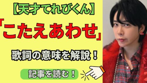 天才てれびくんのmtk(ミュージックテレビくん)にMrs. GREEN APPLEの「こたえあわせ」が採用されましたね! そこで今回は「こたえあわせ」の歌詞の意味を解説しました。 ボーカル大森元貴さんの体験談も歌詞になっているとか?! 詳しく見ていましょう! ... -
